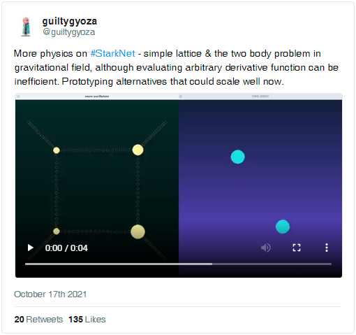 真正的游戏规则改变者将是 L2 网络中的那些独特和创新的应用,这些应用在 L1 网络上甚至不可能部署。比如,我们已经在 Twitter 上看到了@guiltygyoza 已经在以太坊 L2 网络 StarkNet 上面构建了物理引擎和 3D 模型 (见下图)。从长远来看,用户将会使用 Rollups,因为 Rollups 在各个方面都远远优于 L1 网络。从短期来看,开发者的采用和 Token 激励措施对于 L2 吸引新用户可能是有效的。