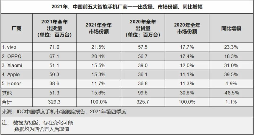 1月28日,根据国际数据公司——IDC的手机季度跟踪报告显示,2021年第四季度,中国智能手机市场出货量约8,340万台,同比下降3.5%。2021年全年中国智能手机市场出货量约3.29亿台,同比微涨1.1%。其中,出货量常年排名第二的vivo品牌,首次成为了中国智能手机市场的“新王”。这家公司2021年在中国一共卖出去了7100万台手机,占据了21.5%的市场份额,同比增幅达到23.3%。vivo之后,OPPO、小米、苹果和荣耀依次进入全国智能手机前五名中的后四位,市场占有率分别为20.4%、15.5%、15.3%和11.7%。IDC认为,vivo 通过其前五厂商中最丰富的产品线布局,在2021年内获取了稳定增长,全年市场份额排名国内第一。其中,X系列,以及子品牌iQOO在2021年内均取得了较明显的增长,帮助vivo在中高端市场,以及线上渠道市场获得了更大的优势。2021年,拆分了荣耀品牌的华为手机,其中国内市场的出货量直接跌出了前五位。而在2020年,这家公司在国内一共卖出了约1.25亿台手机,市场占有率达到38.3%。旧主虽去,新王未稳
