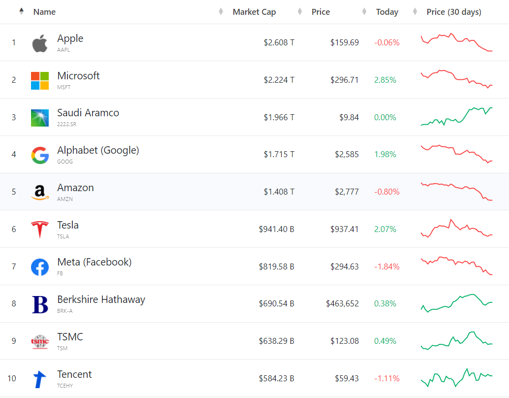 按照标准普尔全球市场财智(S&P Global Market Intelligence)基于最新收盘价的数据,台积电市值排名世界第九,亚洲第一。紧跟巴菲特(Warren Buffett)麾下伯克希尔哈撒韦公司(BRKA)。