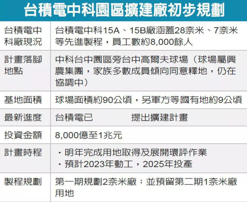 此次计划预计总投资金额将高达8000亿至1万亿新台币(约1840-2300亿元),占地近100万平方米。据联合新闻网报道,位于中部科学园区(中科)的新工厂将占用周边的一个高尔夫球场以及部分公有土地。这也是继竹科宝山之后,台积电规划的第二个2nm晶圆厂。业界指出,相较于后续用地问题仍待解决的台积电竹科宝山2nm工厂,台中高尔夫球场土地所有权单纯,一旦与兴农集团完成协商,很有可能超过竹科宝山建厂进度。根据台积电初步规划,工厂预计在明年获得用地许可并展开环境影响评估,最快于2023年动工,预计可创造约8000个就业机会。这两年由于对芯片需求的剧增,台积电产能扩充与开发较往年可说是「五倍速」前进。为了确保产能的提升,相关的支出也大举拉高,尤其是在先进制程方面。目前台积电在中科的制程涵盖28nm及7nm,由于2nm及1nm制程的设备可以共用,未来将由1.8nm、1.4nm,逐步向1nm推进。业界推测,台积电2nm最快可以在2024年试产,于2025年实现量产,之后再进入1nm,以及后续的「埃米」制程。