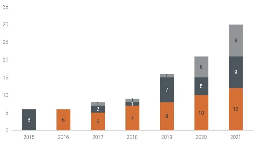 据零壹智库不完全统计,截至2021年8月底,全球曾出现过30家保险科技独角兽企业,其中9家已上市。这些公司总市值或估值已经达到870亿美元,排行如表1所示:数据来源:零壹智库(数据统计截至2021年8月31日)忽略已上市机构,现存的21家独角兽公司中,估值40亿美元及以上的有3家,20~40亿美元的有8家,20亿美元以下的有10家,除Bolttech外,融资阶段均在C轮及以后。目前为止,保险科技领域还未出现估值达到100亿美元的超级独角兽,Gusto在获得8月的E轮融资过后,估值已经上升至95亿美元,是目前现存估值最高的独角兽公司。从业务类型[1]来看,医疗健康险独占9席,包括微医、水滴、镁信健康和思派科技等“健康+医疗+保险”模式类公司[2];保险SaaS、数字化车险和综合保险各占3席,网络安全险2席,产权保险1席。从时间上看,2015-2018年全球新晋保险科技独角兽企业较少,它们中的大多数目前都已经上市。2019年开始,头部保险科技公司估值节节攀升,当年有7家企业成为新晋的保险科技独角兽,其中水滴公司、Lemonade、Root Insurance等4家已经上市。2021年,新晋独角兽公司数量再创新高,前八个月便达到了9家。2021年1月,印度保险定制平台Digit Insurance跻身保险科技独角兽行列,是本年最早成为独角兽的公司。紧跟其后,美国健康保险公司Sidecar Health于26日获得1.25亿美元C轮融资后估值达到10亿美元。Gusto于今年8月12日获得了E轮融资,融资过后估值上升到了95亿美元,是目前估值最高的独角兽公司。从地区分布上看,美国独揽17家(其中7家已上市),中国有5家(其中2家已上市),英国有3家,印度有2家,德国、法国、新加坡各有1家。相较于2021年1月零壹智库统计数据,美国的保险科技独角兽数量在半年间新增4家,领跑全球;中国新增3家,增速位居第二。此外,欧洲增加了3家(英国2家、法国1家),印度保持不变,新加坡首次出现保险科技独角兽公司。保险科技独角兽公司的地区分布以及数量变化显示,目前世界保险科技正处于高速发展的阶段,行业内的独角兽公司不仅仅存在于传统的技术强国中,也开始在其他国家崭露头角。
