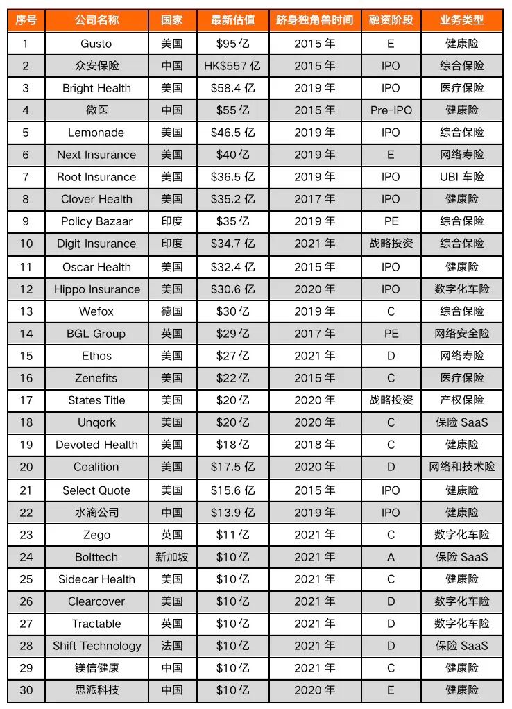 一、全球现存21家保险科技独角兽,健康险赛道火热
