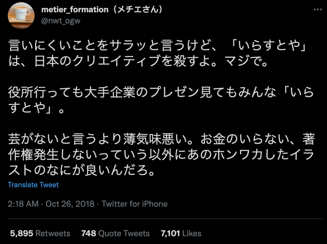 这种较为新颖的商业模式,曾多次被日本 网民吐槽“Irasutoya毁了日本设计行业”,而原因则是“因为Irasutoya如此便利,大企业都不会专门去找设计师了”