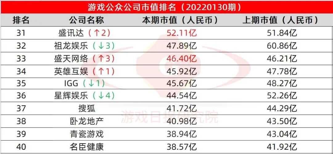 此外,本期市值跌幅超过10%的还有第6名的金山软件(-10.33%)、第9名的昆仑万维(-11.07%)、第10名的巨人网络(-11.42%)、第11名的汤姆猫(-15.03%)、第16名的浙数文化(-25.33%)、第17名的神州泰岳(-14.05%)、第18名的掌趣科技(-17.19%)、第20名的姚记科技(-17.39%)、第25名的凯撒文化(-11.40%)、第27名的电魂网络(-12.73%)、第28名的中青宝(-14.71%)。