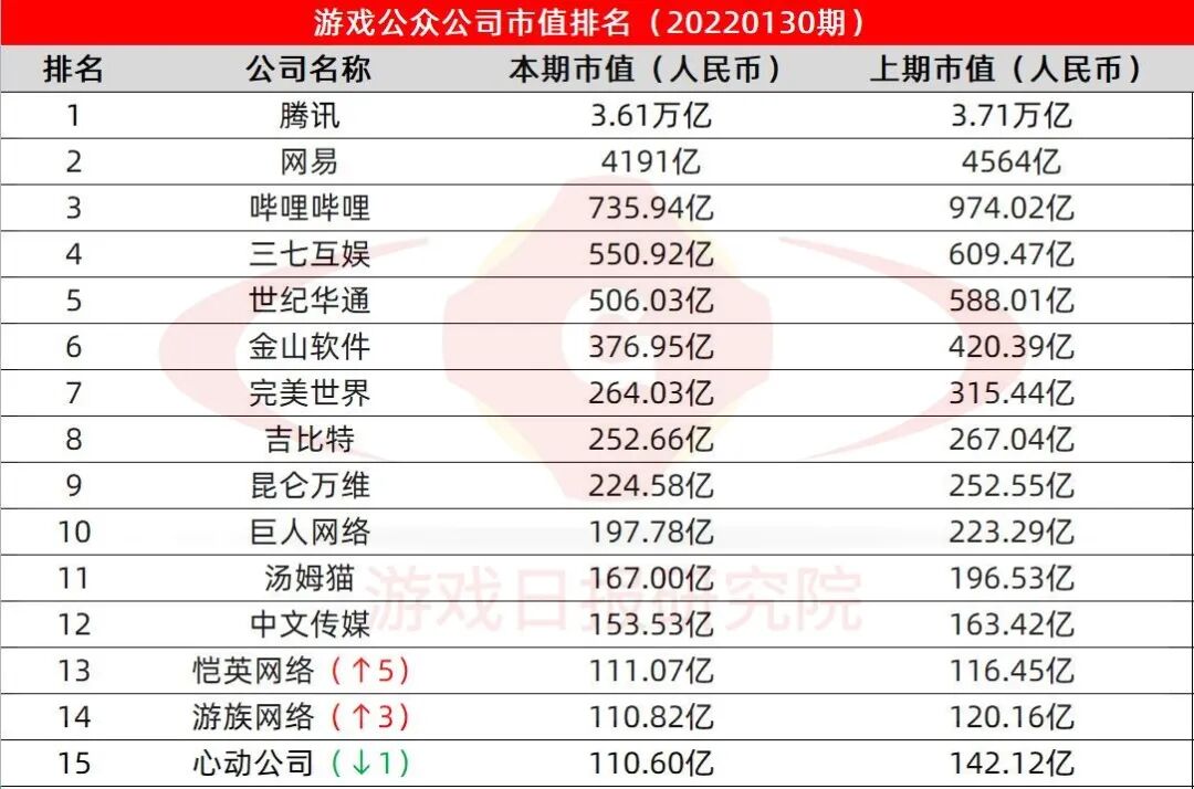游戏日报研究院推出【游戏公众公司市值排行榜】,助各位读者实时了解行业现状与未来前景。