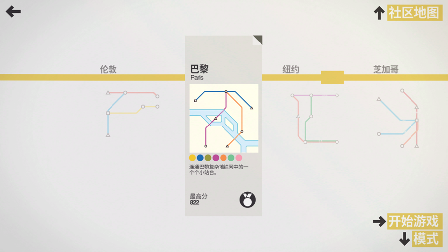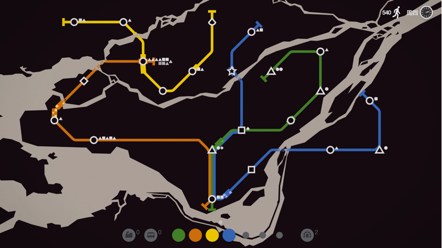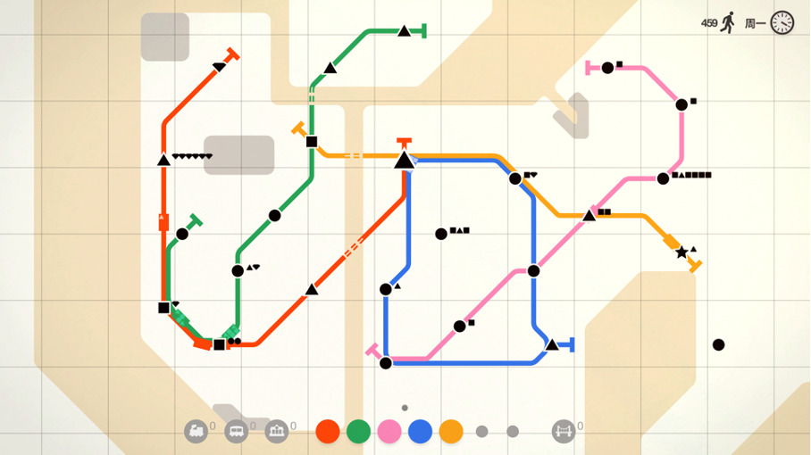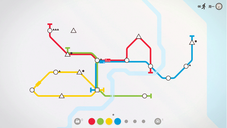 以线条作为地铁线路,以圆圈、三角、矩形等几何图形代表了站点、乘客、列车等地铁主要元素,在有限的时间和资源面前,设计出合理的地铁通勤路线来避免交通堵塞。这种基于现实地铁特色而延伸出的策略性玩法,和极简的画面表现十分匹配,并且加上以各种现实城市为蓝本的关卡地图,在游玩过程中更像是在把玩、设计一张简洁精美的地铁地图。