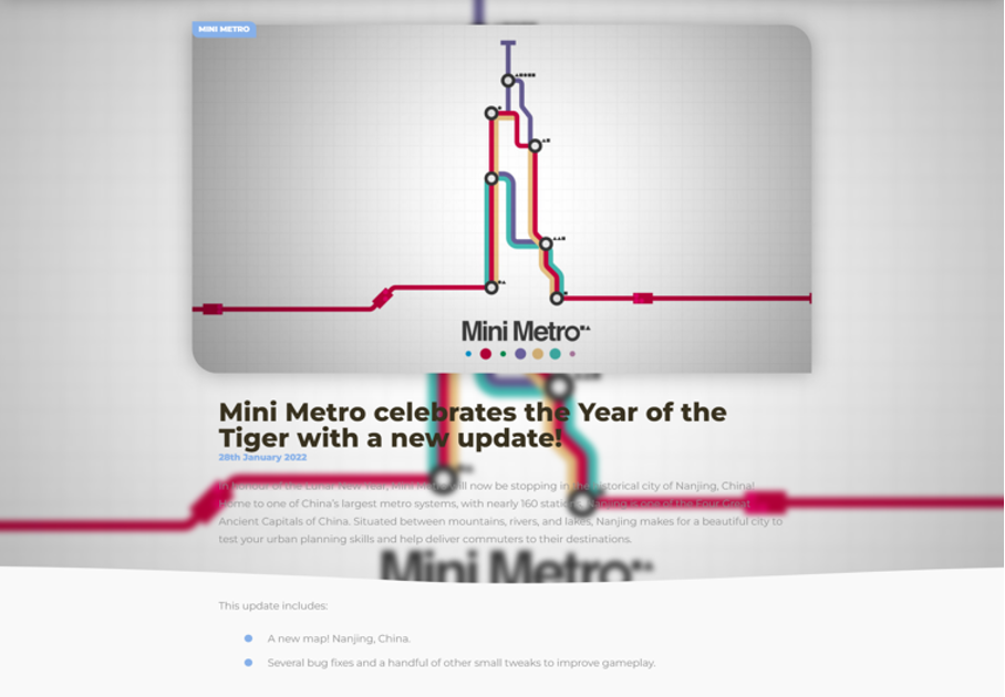 到了2013年9月,正式命名为《Mini Metro》的游戏Alpha版在网络播放器上发布,团队针对其设计了网站,让游戏直接地现实在页面前段和中心,游玩很方便并且获得了病毒式的传播效果,带来了大量的关注度,许多人都被一个可以制作自己的地铁地图的网站而吸引。