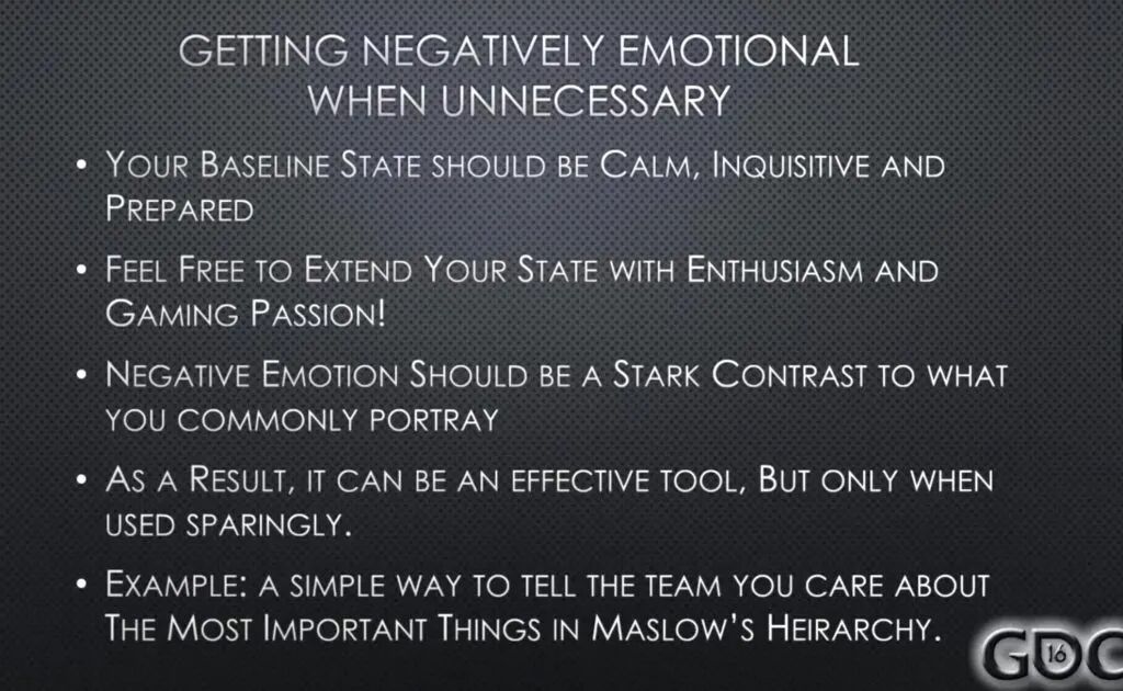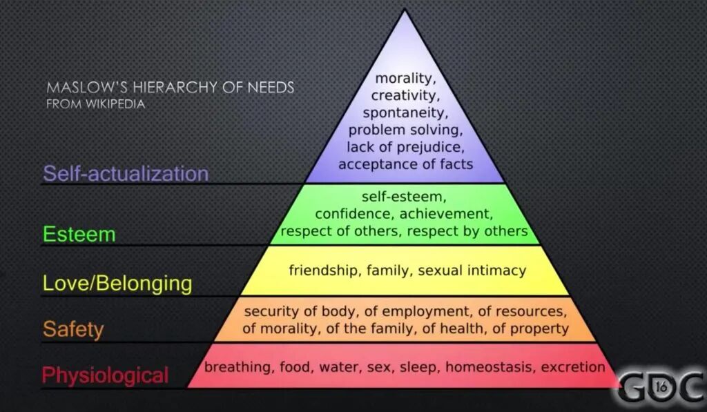不过,基本状态并不意味着你不能使用情绪,尤其是在对团队有益的时候,我希望你能尽可能的多调动团队情绪。很多人可能都熟悉马斯洛需求理论,比如有人的电脑不好使、暖气不工作等等,你需要确保团队成员处于心理和生理双重安全的状态,作为制作人,这些事情也是你应该关心的。