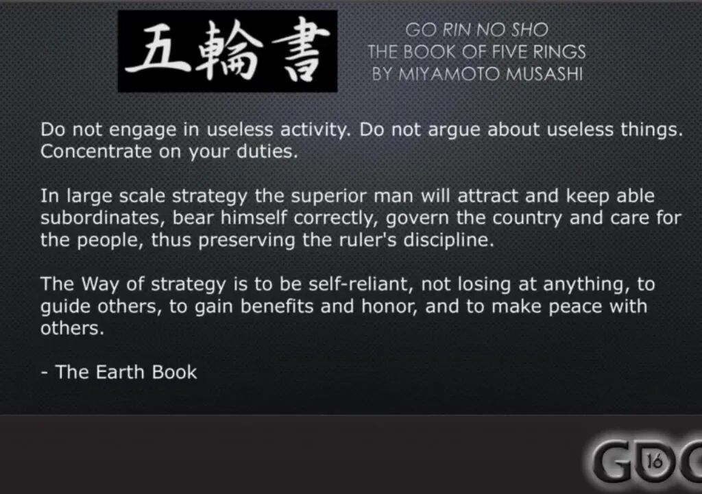 宫本武藏写的《五轮书》是我最喜欢的一个,基本来说,不要做任何没有用的事,如果你只专注于能够推动团队发展的事情,你就会推动团队前进。这会帮你有效利用项目资金,打造一个自我激励的团队文化。