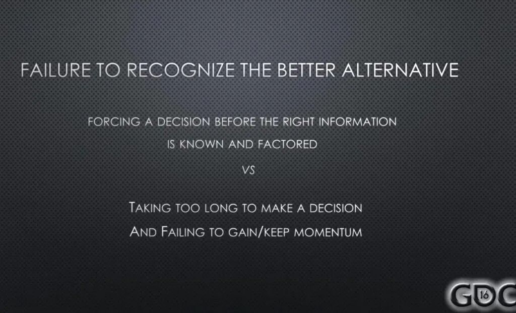 没能认识到更好的选择。总有人说,他们不得不在没有足够信息的情况下做出决定,以至于错过了最好的决策,但我要说的是,作为制作人,你的工作职责之一就是在这种情况下做出最好的决定,你可能会根据自己掌握的领域做出决策,如果你有时间,可以这么做。