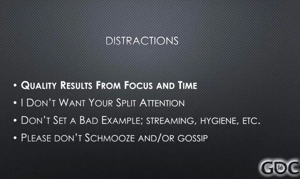 在《无主之地2》的时候,我和这款游戏的高级策划坐下来讨论项目规划,我们讨论什么是高品质的结果,那就是集中注意力和时间,而不是让团队分心。不专注会带来很多的问题,并且长期下来会影响研发进度,所以打造团队的时候,首先要设立好的典型。