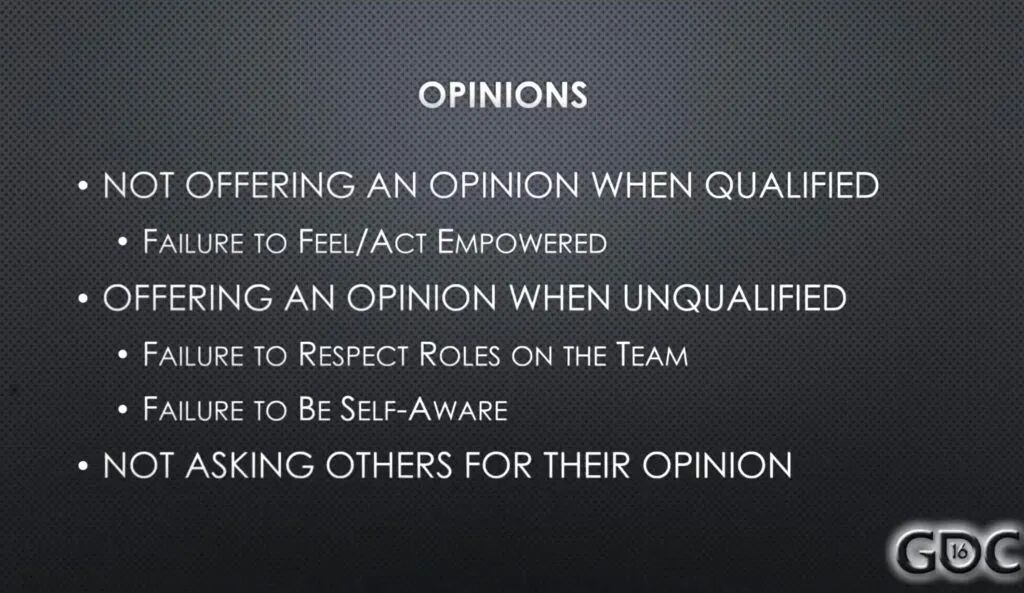 另一个错误是,没有资格的时候却表达了观点。如果你在一个团队,这个团队正在招聘策划,请不要经常给策划团队输出观点,如果你有观点那是很好的,但要确保你在帮助团队更明智地使用他们的时间,实际上,我每年都要有一段时间专门就这个问题培训新的制作人。