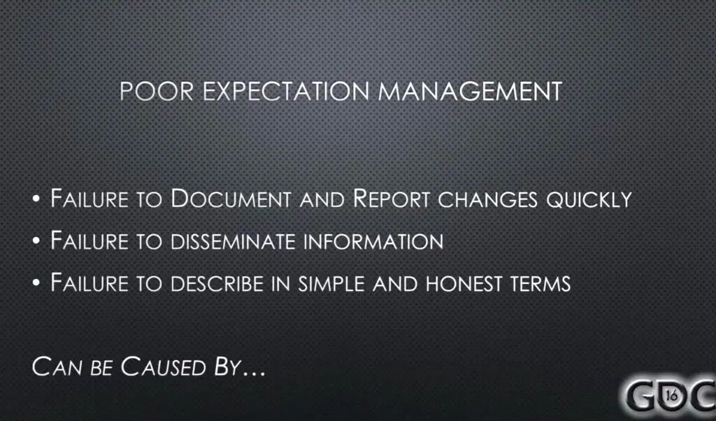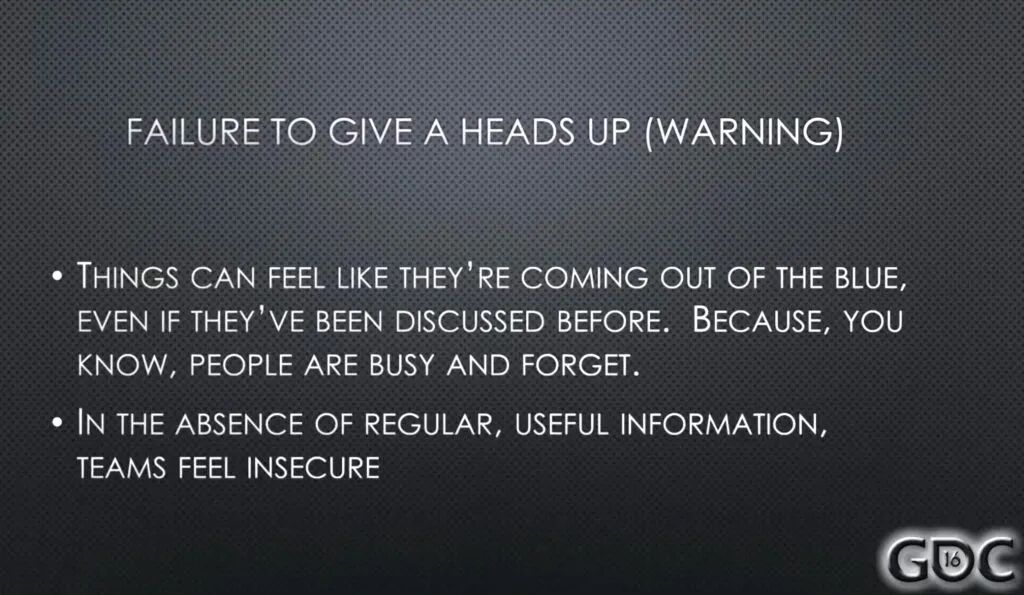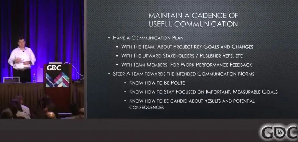 优秀的制作人都会保持有效的沟通,而且是有意为之的。当你传递信息之后,要经常思考团队是怎么理解的,他们对你经常提供的信息是如何看待的?所以你要给自己的预期是为团队提供信息,哪怕不是很多事情,也要用常规的方式经常传递一些信息,让他们知道游戏制作发生了什么事情,这样会让他们觉得更安全,不会担心有他们不知道的决策发生。