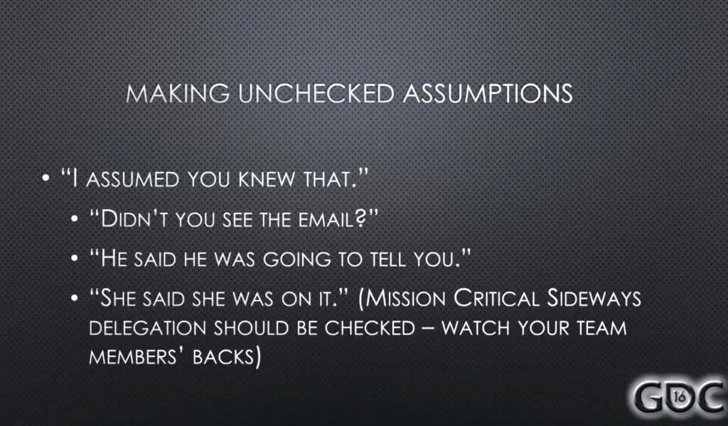另一个容易带来问题的是未经核实的假设。在沟通模型中,信息是经过多次传递的,你希望按照意向中的方式传递,这是你的责任。我觉得比较有趣的是,很多制作人的确会进行跨部门沟通,但往往不会检查沟通信息是否按照想象中的传递。