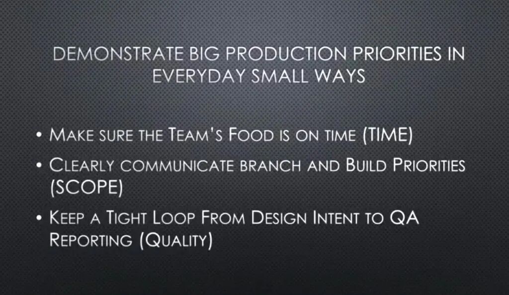 所以,领导力要领第一条,你必须是团队最好的代言人,作为真正出色的制作人,与你一起工作的所有人都需要知道当你与他们聊天的时候,你所做的一切都是希望团队更好,你是团队里的关键角色,不要损害自己的形象。