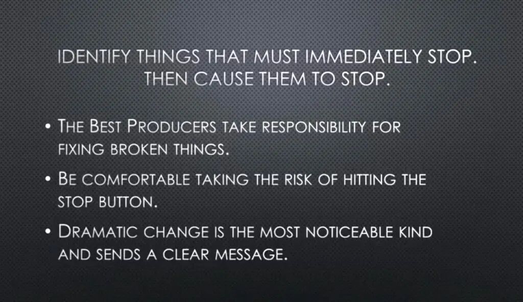 你要辨别团队需要做什么样的新任务、放弃哪些东西,你一定会遇到一些必须被制止的事情。在团队文化中打破恶性循环,或者避免项目陷入陷阱、导致工作室关门的事情,唯一的方式就是制止糟糕的事情发生,越快越好,这是制作人的责任。