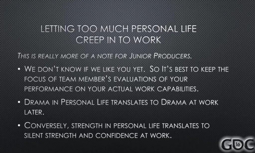 相反,把个人生活带到工作里也是很不合适的,尤其是新手制作人很容易出现这样的现象。除了工作职责相关的事情之外,大多数的同事都并不想听到太多你个人生活的事情。不过,你应该将生活当中有用的经验带给团队,比如一些可能让团队成长的案例。