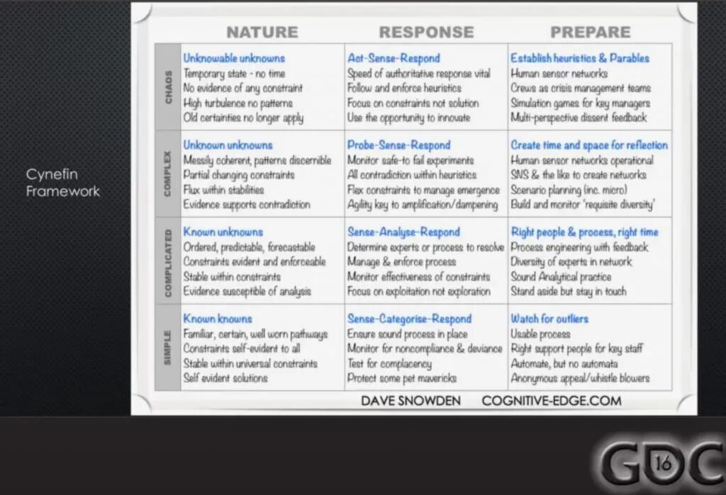这里我没有写进去的是价值管理,比如既定的项目预算下,你做什么用了多少开支,你的规划越仔细,项目制作后期需要面对的问题就越少。Cynefin(Ku-Nev-In)决策框架可以让你理解自己处于什么环境,并基于这个意识做解决方案,从一个好的游戏制作人,成为优秀的制作人,这是你必须掌握的。