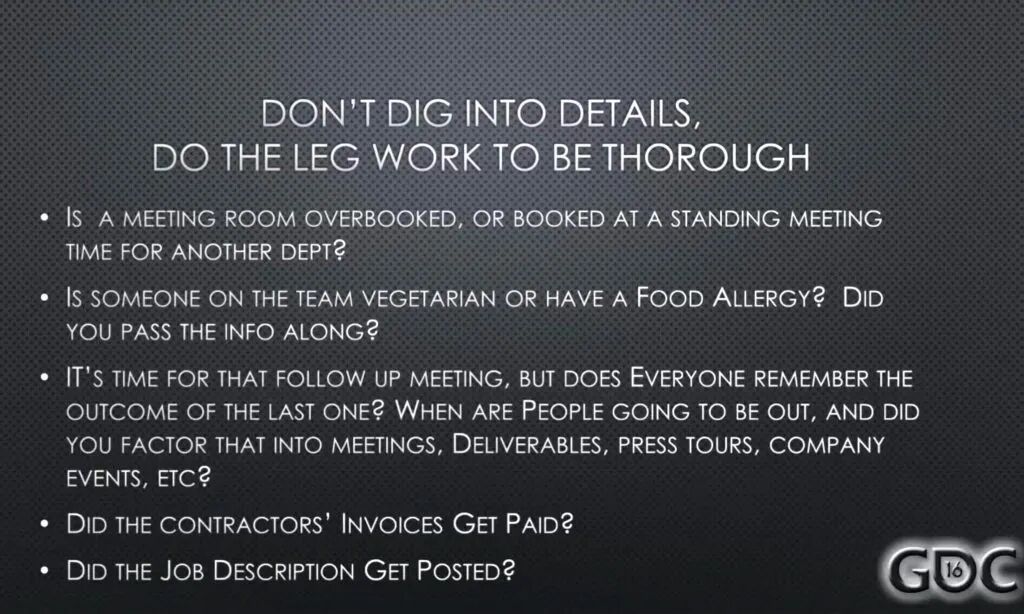 有时候,你可能非常善于和团队协作,一起解决任务,你擅长很多领域的事情,但很多的小细节会逐渐累积,至少与和一起工作的话,太多的细节问题会影响你的晋升,比如会议室是否能用、你是否了解团队成员有什么饮食忌讳,外包发票是否已经付费……这些事情实际上很常见。