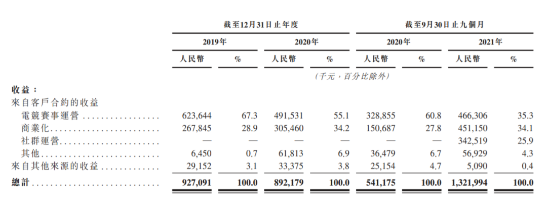 在商业模式上,英雄体育VSPN已形成了电竞赛事运营、商业化、社群运营并行。2021年前九个月的数据显示,以上三块收入分别贡献了4.66亿元,4.51亿元,3.43亿元人民币的营收,在总营收中的占比分别为35.3%,34.1%,25.9%。