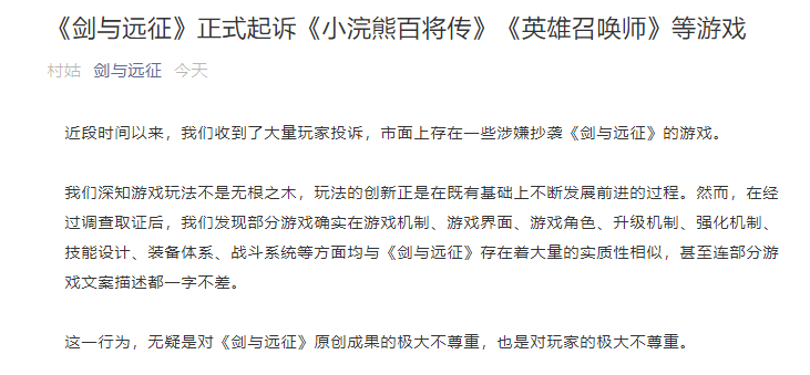 莉莉丝表示:“我们深知游戏玩法不是无根之木,玩法的创新正是在既有基础上不断发展前进的过程。然而,在经过调查取证后,我们发现部分游戏确实在游戏机制、游戏界面、游戏角色、升级机制、强化机制、技能设计、装备体系、战斗系统等方面均与《剑与远征》存在着大量的实质性相似,甚至连部分游戏文案描述都一字不差。我们乐于看到行业百花齐放,各家博采众长不断创新前进。但是对于涉嫌抄袭的行为,我们绝不会进行容忍。相信法律会给出公正的裁决,为中国游戏产业营造更加健康的市场环境。未来《剑与远征》将在原创道路上一如既往的进行探索尝试,希望我们能做得更好。”