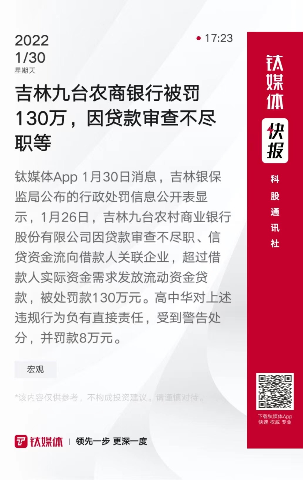 吉林九台农商银行被罚130万,因贷款审查不尽职等