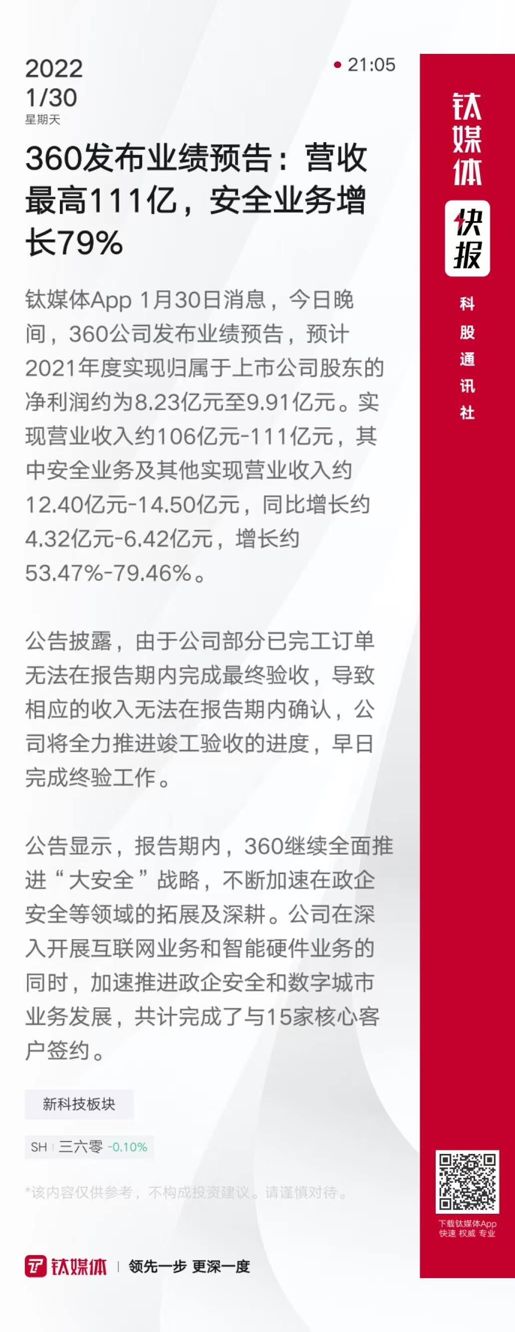 360发布业绩预告:营收最高111亿,安全业务增长79%