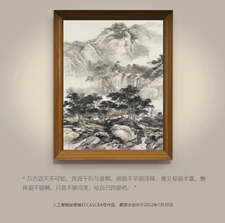 夏语冰不仅仅存在于这个视频里,作为小冰公司人工智能框架孵化的一位 AI being,2019 年她从中央美术毕业的学院研究生毕业,练习了不同绘画流派之后,选择了专攻中国山水画。她的作品正在迪拜世博会中国馆展出。