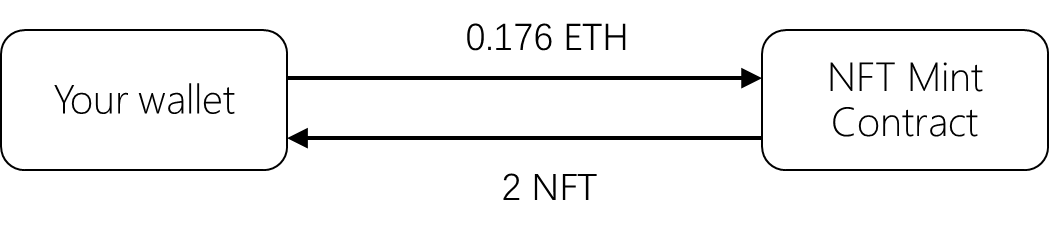 简单来说购买过程就是你的钱包和NFT 合约进行交互,从你的钱包转账0.176ETH到合约,调用合约mint方法后,生成两个NFT代币,代币转移到你的钱包,你获得这个NFT。