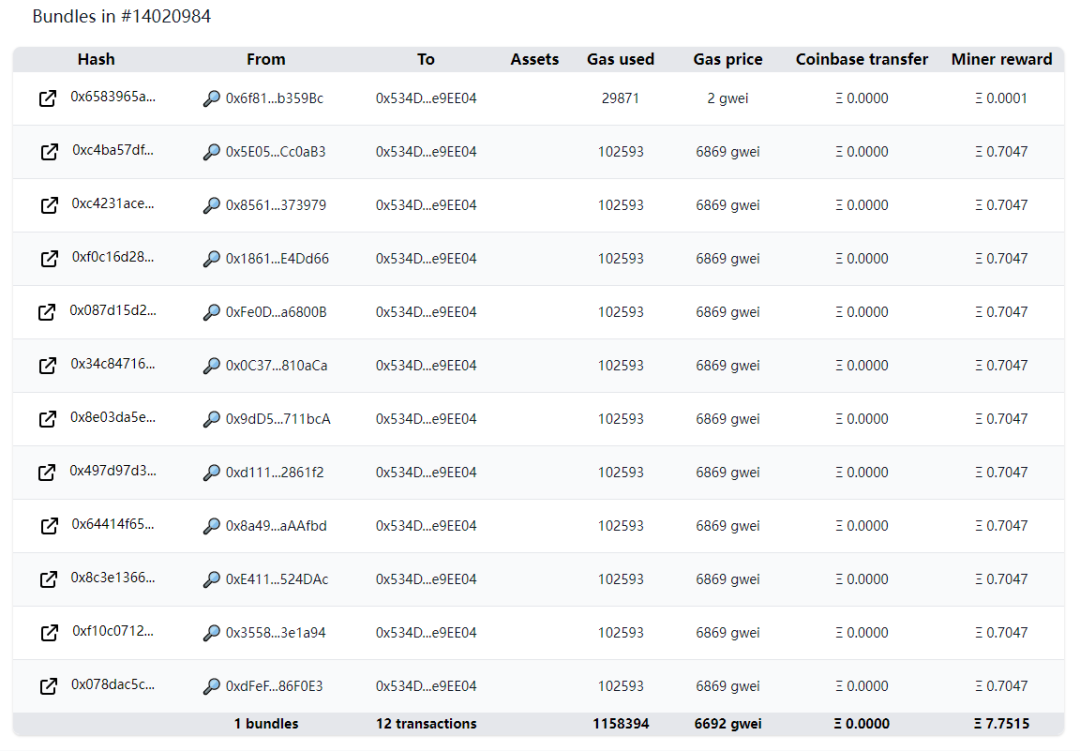 然后有科学家把setStatus TX和自己的mint tx一起用flashbots打包了,发送给矿工。这里科学家把setStatus TX放到了第一,虽然它Gas低,将自己的mint tx排在后面,最终tx在984块入链。
