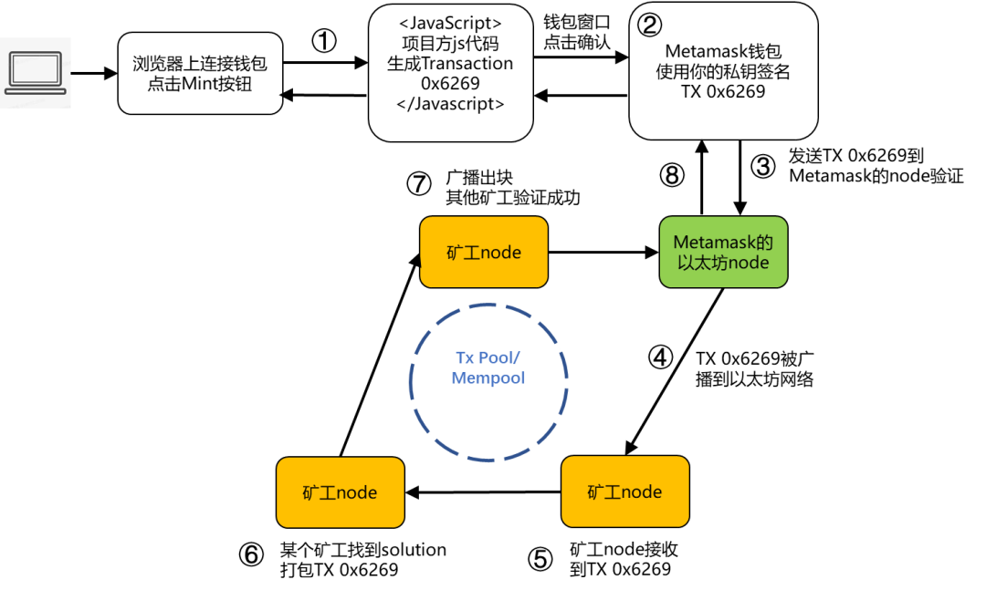 将你从项目方的官方网站上点击mint按钮,从浏览器到以太网网络端到端交互过程详细打开: