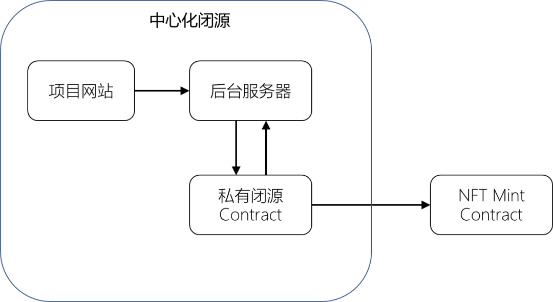 类似最近火热的HAPE的做法,公开的NFT合约限制只能一个私有的闭源的合约才能mint。闭源合约后项目方后台服务器交互, 这个方案从技术上来说还是走web2中心化思路和web3去中心化的理念好像有点冲突。