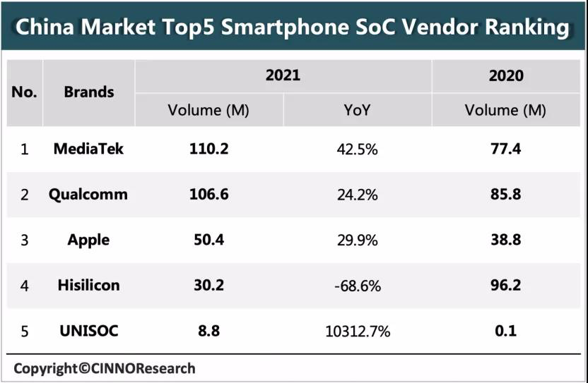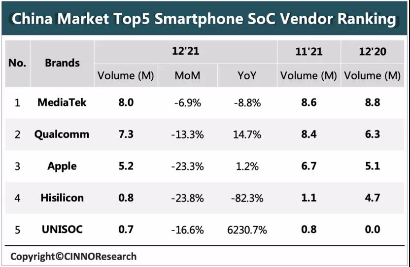 随着2021年结束,处理器市场的“战斗”也进入了新的一年,而就在近日,CINNO Research发布了2021年中国智能手机SoC市场的调研报告。