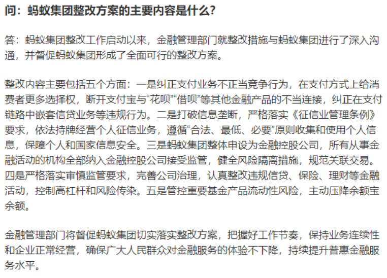 而第三条中提到,蚂蚁集团整体申设为金融控股公司。今年4月13日,阿里巴巴已经发布公告称,蚂蚁集团将整体申设金融控股公司,实现金融业务全部纳入监管。