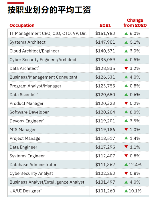 按照职业划分,2021年,IT经理人、高管(CEO、CTO等)平均收入超过15万美元,位列收入排行榜前列的还有系统架构师、云架构师、网络安全工程师等职位,平均收入均在12万美元以上。