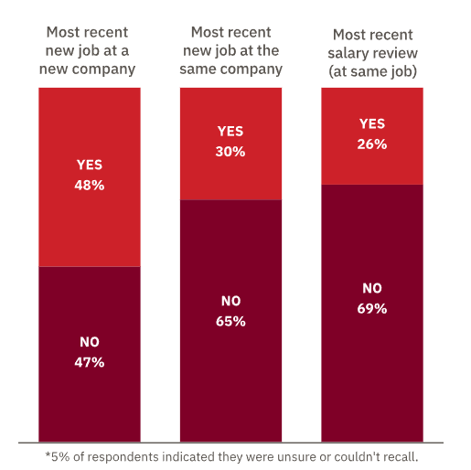 如果是跳槽到新公司,48%的科技工作者在工作前沟通过薪资问题。10%的被调查者2021年工资降低,是因为他们换工作了。