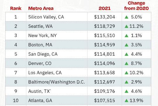 报告显示,2021年全美排名靠前的技术人员的薪资比2020年均有所增长,涨幅最高的亚特兰大地区较2020年增长13.9%,西雅图、洛杉矶地区涨幅均超过10%。