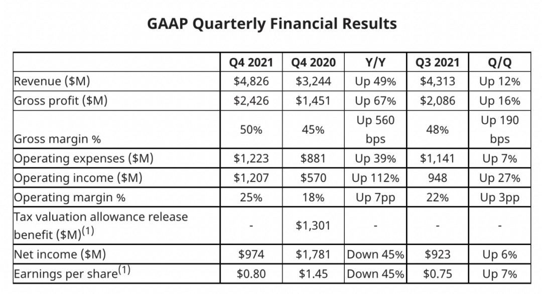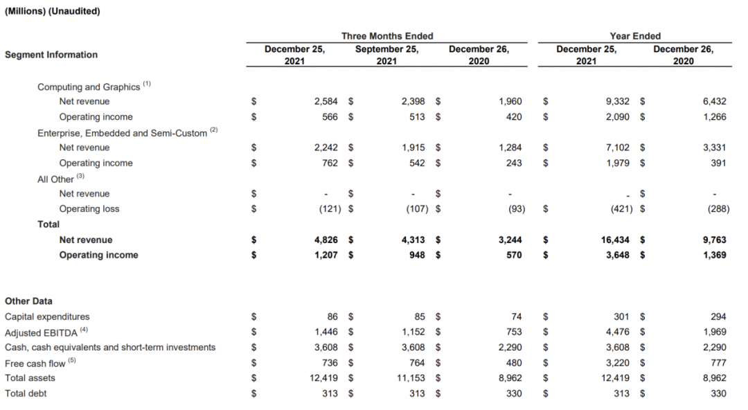 根据财报,AMD当季营收48.26亿美元,同比增加49%,环比增加12%。GAAP毛利24.26亿美元,同比增加67%,环比增加16%。GAAP净利润9.74亿美元,同比下滑45%,环比增加6%。不按美国通用会计准则的话,净利11.22亿美元,同比增加76%,环比增加25%。2021全年,AMD实现营收164.34亿美元,同比增加68%;GAAP净利润31.62亿美元,同比增加27%;非GAAP净利润34.35亿美元,同比暴涨118%。各业务细分方面,AMD第四季度来自于计算和图形部门的营收为25.84亿美元,高于上年同期的19.60亿美元和上一季度的23.98亿美元;运营利润为5.66亿美元,相比之下上年同期的运营利润为4.20亿美元,上一季度的运营利润为5.13亿美元。AMD第四季度来自于企业、嵌入和半定制业务的营收为22.42亿美元,高于上年同期的12.84亿美元和上一季度的19.15亿美元;运营利润为7.62亿美元,相比之下上年同期的运营利润为2.43亿美元,上一季度的运营利润为5.42亿美元。AMD第四季度来自于其他所有业务的运营亏损为1.21亿美元,相比之下上年同期的运营亏损为9300万美元,上一季度的运营亏损为1.07亿美元。而对于接下来的业务展望,AMD预计2022财年第一季度营收约为50亿美元,上下浮动1亿美元,同比增长约45%,环比增长约4%,超出分析师预期。AMD还预计,在整个2022财年,该公司的营收将达215亿美元左右,同比增长约31%,超出预期;并预计不按照美国通用会计准则的调整后毛利率将达51%左右。![]()