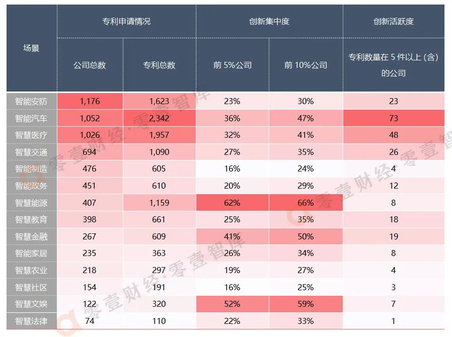表1: 2021年计算机视觉专利排行榜TOP100注1:数据统计2020年7月至2021年6月申请并公开的专利。为了解计算机视觉产业应用情况,零壹智库选取了最受关注的14个场景作为研究方向,通过创新集中度和创新活跃度两个维度对各场景专利分布情况进行解析。其中,创新集中度是指各场景专利数量前5%和前10%的企业在整个赛道专利数量占比;创新活跃度是指专利申请数量在5件以上(含)的公司数量。注1:公司数量仅统计了相关专利数量超过2件以上的公司。注2:数据统计2020年7月至2021年6月申请并公开的专利。从专利活跃度视角来看,过去一年,智能汽车、智慧医疗是计算机视觉领域活跃度最高的两个赛道,这两赛道均聚集了超过1000家公司参与专利申请。创新集中度数据显示,这两赛道马太效应一般,但是创新活跃度均超过40,可以说明这两赛道正处于激烈竞争阶段。从创新集中度视角来看,在智慧能源和智慧文娱赛道马太效应明显。在智慧能源赛道,有超过400家公司参与专利申请,专利合计约1200件,有66%的专利掌握在10%的企业手中。其中,国家电网和南方电网过去一年专利申请数量分别为460件和166件,合计占比为52%。智慧文娱赛道有大约120家公司参与专利申请,专利合计320件,有大约60%的专利掌握在10%的企业手中。其中,腾讯、网易和米哈游三家公司专利申请数量分别为88件、40件和19件,合计147件,占比为46%。注1:数据统计2020年7月至2021年6月申请并公开的专利。自2015年以来,包括互联网科技公司、传统造车企业和科创企业相继开展了对智能汽车、自动驾驶、辅助驾驶领域的研发和投入。尤其2021上半年,小米正式宣布投资100亿元开始造车项目;百度以整车制造商身份进军汽车行业,并与吉利成立集度汽车;传统汽车产商五菱汽车、一汽红旗、比亚迪、广汽丰田、东风汽车相继推出新款智能汽车;科创企业初速度(Momenta)在3月获得5亿美元C轮融资,图森未来4月份在美国纳斯达克上市,市值接近150亿美元。大量参与者的加入和资本市场的关注,智能汽车一度成为疫情以来最受关注的领域的之一。而计算机视觉作为实现自动驾驶、辅助驾驶、智能座舱的核心技术之一,也同样成为了热门技术。在过去一年,智能汽车领域专利申请数量大于等于3件的公司有166家,专利合计1277件。其中,代表企业有科佳股份(68件)、百度(45件)、大华股份(41件)、小鹏汽车(38件)等。注1:数据统计2020年7月至2021年6月申请并公开的专利。新冠疫情的爆发,激起了社会对医疗行业的广泛关注,同时让医疗行业数字化智能化升级转型变的更加迫切。面对医疗资源的短缺、医护人员能力和经验的参差不齐,以计算机视觉、大数据为代表的数字科技通过赋能医疗行业,可以有效缓解医院和医生的压力,同时还能提高工作效率,提升病患的治疗效率和满意度。其中,计算机视觉在医疗诊断、医药、防疫等方面有着重要作用。例如,为解决镜检人力不足的临床痛点,腾讯 AI Lab利用计算机视觉等前沿算法,与迈瑞医疗共同研发自动化的血细胞分析仪,能够发现细胞质量改变,其细胞识别能力可达到世界领先水平,可有效解决国内医院“缺人”、医师“缺经验”的问题。此外,智慧医疗板块在资本市场也受到了青睐。2021上半年,港股市场新增12家医疗保健及生命科学企业,共募资港元286亿元,占募资总额的13%。在一级市场,多家医疗科技公司获得上亿规模融资,例如百力司康、药兜网、宽岳骨科、望石智慧、岸阔医药、英矽智能(Insilico Medicine)、汇禾医疗、深瑞医疗。从技术角度来看,过去一年智慧医疗领域专利申请数量大于等于3件专利的公司有134家,专利合计901件。其中代表企业有平安集团(105件)、联影(79件)、吾征AI(34件)、依图(28件)等。除此之外,从专利申请情况、创新集中度和活跃度来看,我国计算机视觉在智能制造、智能家居、智慧农业等赛道的关注度还有很大的提升空间。其中,在智能制造赛道,尽管有476家公司参与专利申请,但是仅4家公司专利申请数量在5件以上,占比不足1%。智能家居赛道,有234家公司参与专利申请,有8家公司专利申请数量在5件以上,占比为3.4%。智慧农业赛道,有218家公司参与专利申请,有4家公司专利申请数量在5件以上,占比为1.8%。尽管这些赛道已经聚集了超过200家以上的公司参与专利申请,但是从专利活跃度来看,我国在智能制造、智能家居和智慧农业缺乏持续的关注度和研发投入。2020年政府工作报告提出加强新型基础设施建设,以及2021年十四五规划提出的数字化改造,都是在鼓励传统行业借助人工智能等新型技术进行数字化转型。通过过去一年计算机视觉专利申请情况,我们发现以下趋势:首先专利数据显示,在过去年一年,这两赛道聚集了超高了1000家公司参与专利申请,并且有超过40家公司专利申请数量在5件以上。智慧医疗赛道。近些年,除了医疗科技公司之外,互联网科技巨头、人工智能科创企业等也在进行布局。包括平安集团、依图、腾讯、百度、商汤科技在内的公司不仅参与了相关专利申请,同时也研发出自己的产品体系。例如,商汤科技推出了提供覆盖诊-疗-愈全流程的智慧健康解决方案和产品;依图推出了care.ai医疗智能全栈式产品解决方案。智能汽车赛道。最新政策删除申请新能源汽车生产企业准入有关“设计开发能力”的要求,降低了赛道准入条件。对于新进入者而言,将车辆设计开发