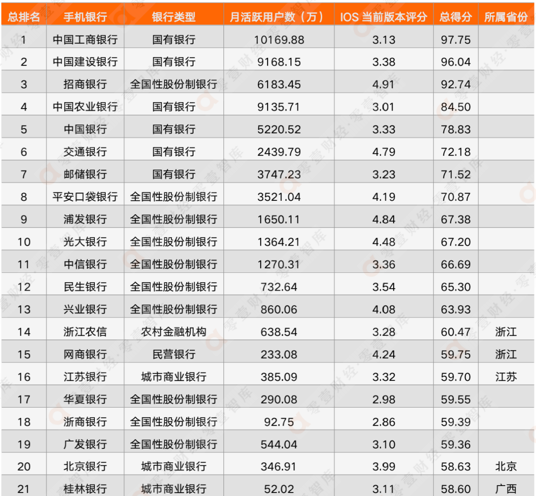 四、IOS评分排名:招商银行排首位,宁波银行、网商银行评分较高