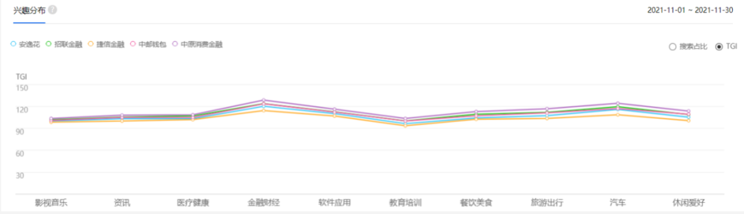 用户画像反映了关注消费金融APP的用户的年龄、性别和兴趣分布。根据百度指数总结的用户画像可以看出,无论从年龄分布,还是性别、兴趣分布来看,整体五款 APP 的用户偏好相近,较为同质化。