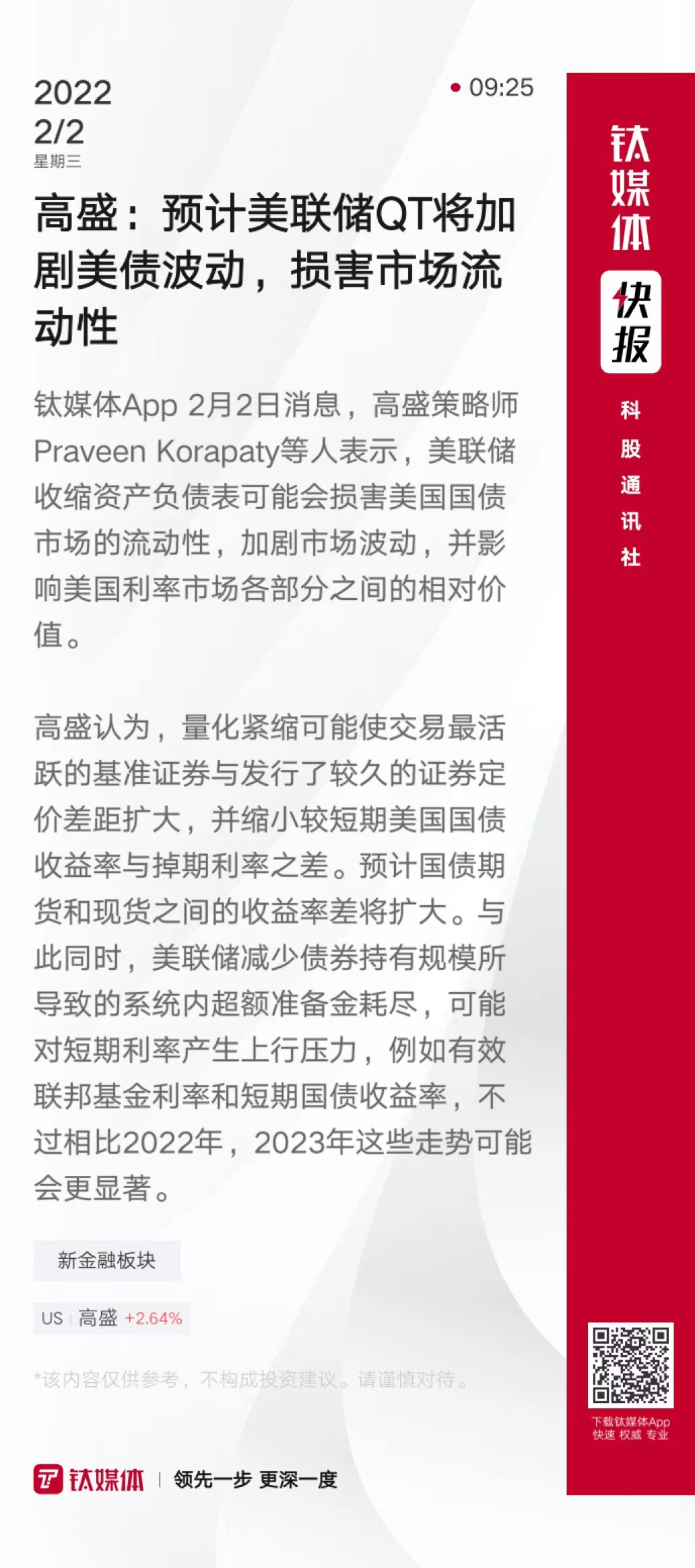高盛:预计美联储QT将加剧美债波动,损害市场流动性