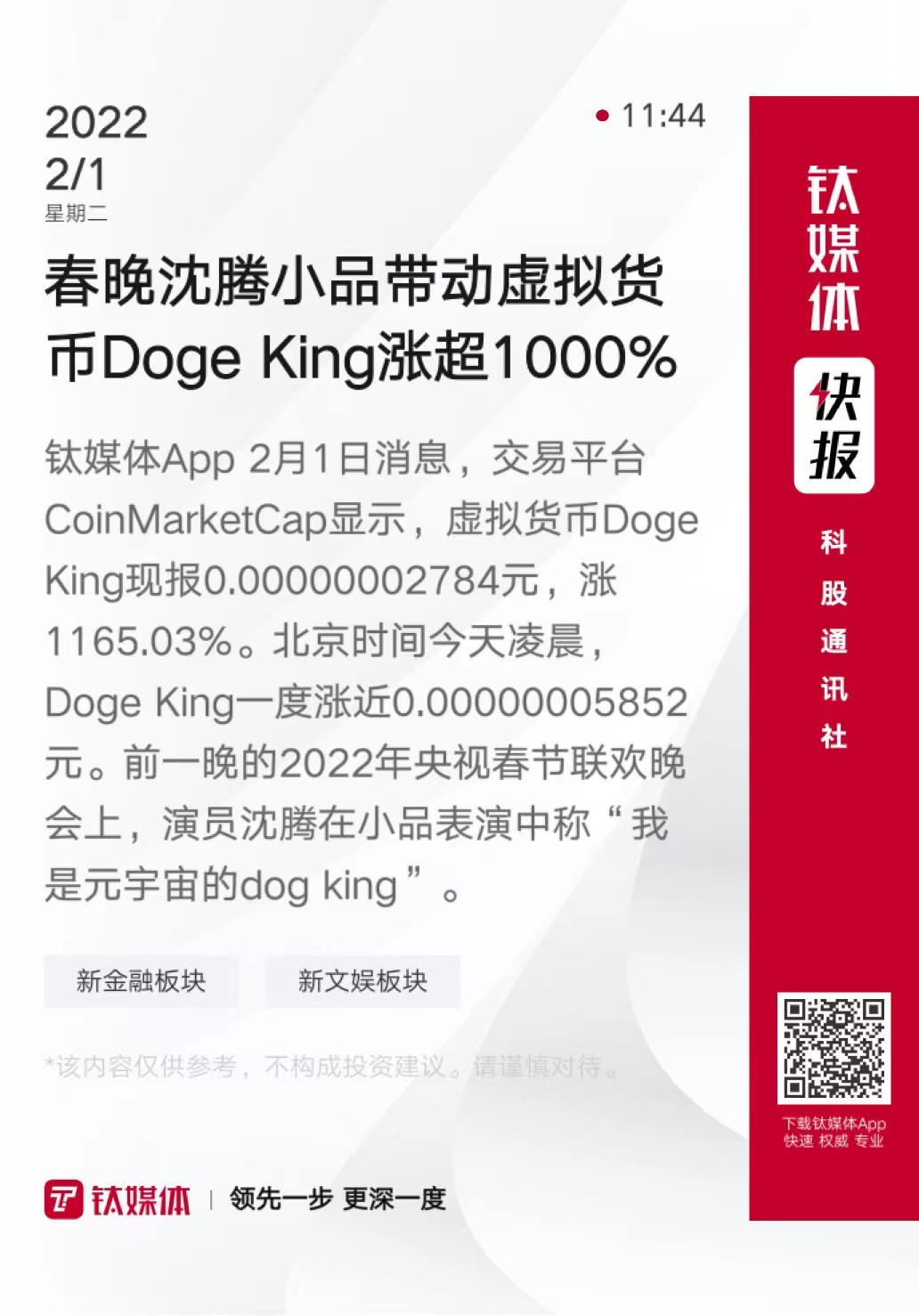 春晚沈腾小品带动虚拟货币Doge King涨超1000%