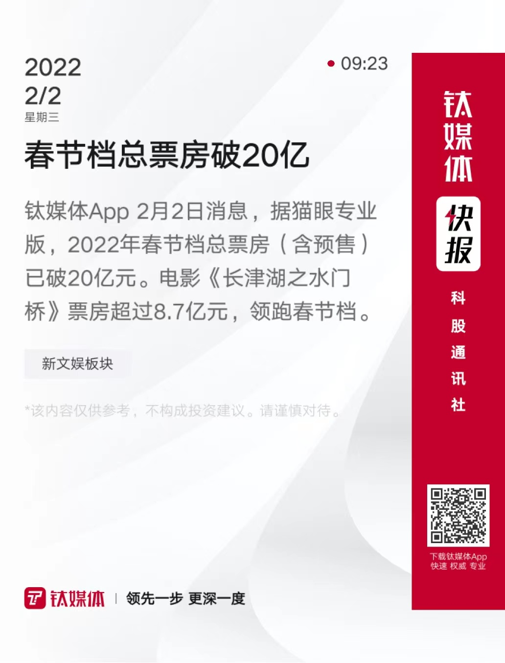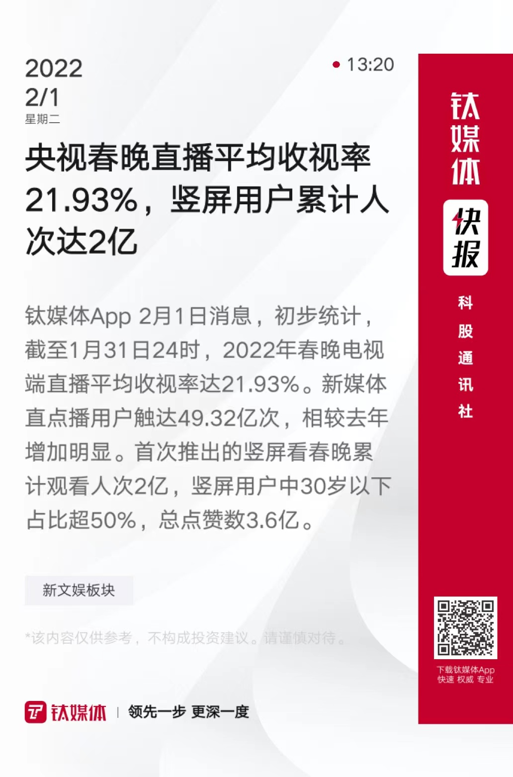 央视春晚直播平均收视率21.93%,竖屏用户累计人次达2亿