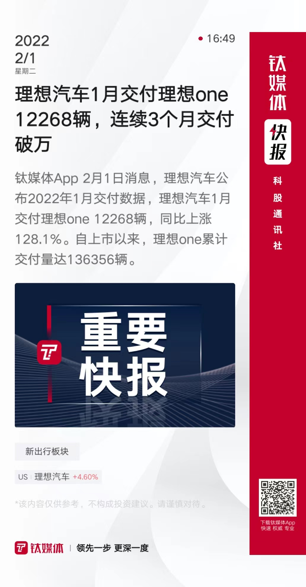 理想汽车1月交付理想one 12268辆,连续3个月交付破万