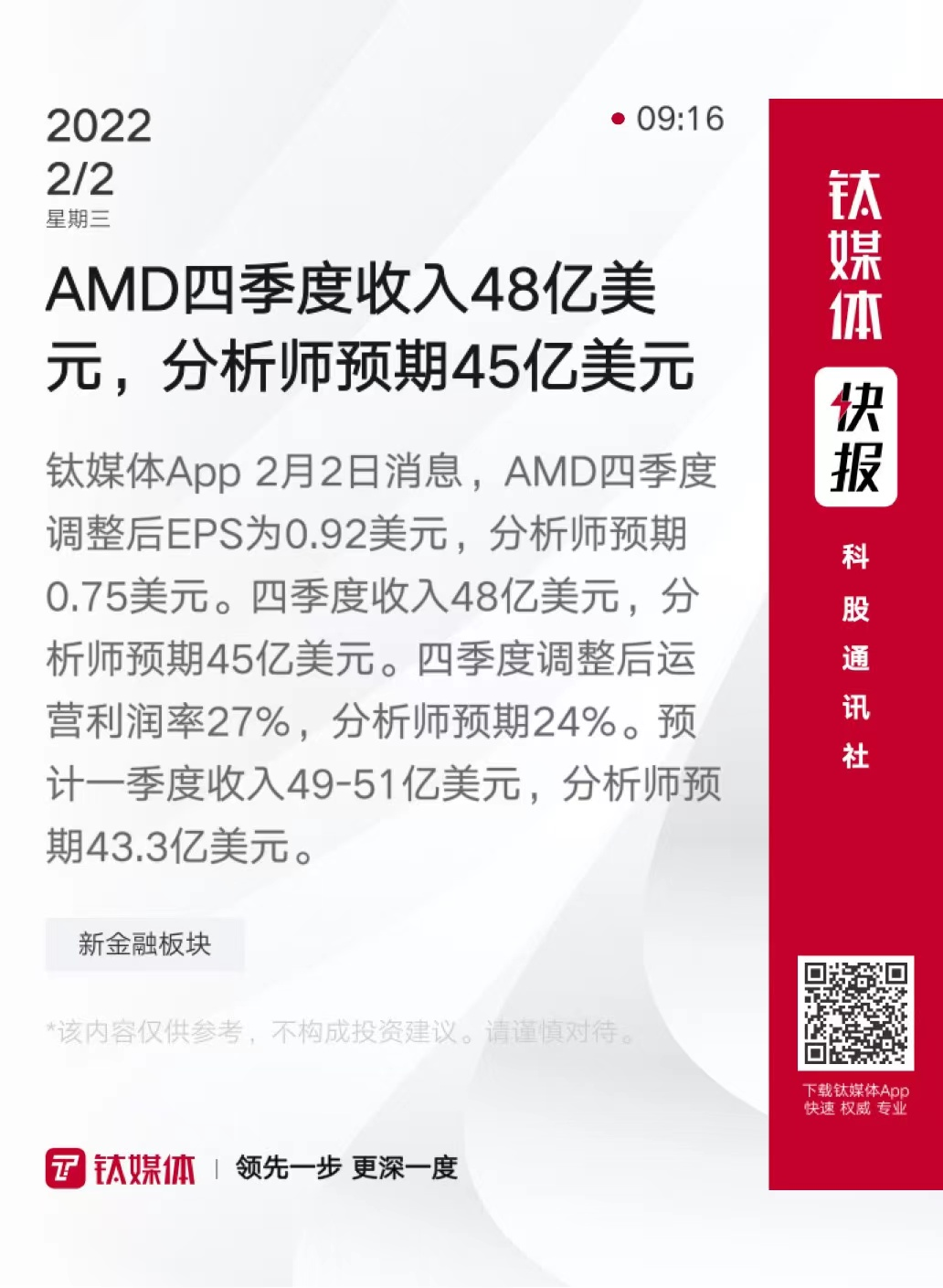 AMD四季度收入48亿美元,分析师预期45亿美元