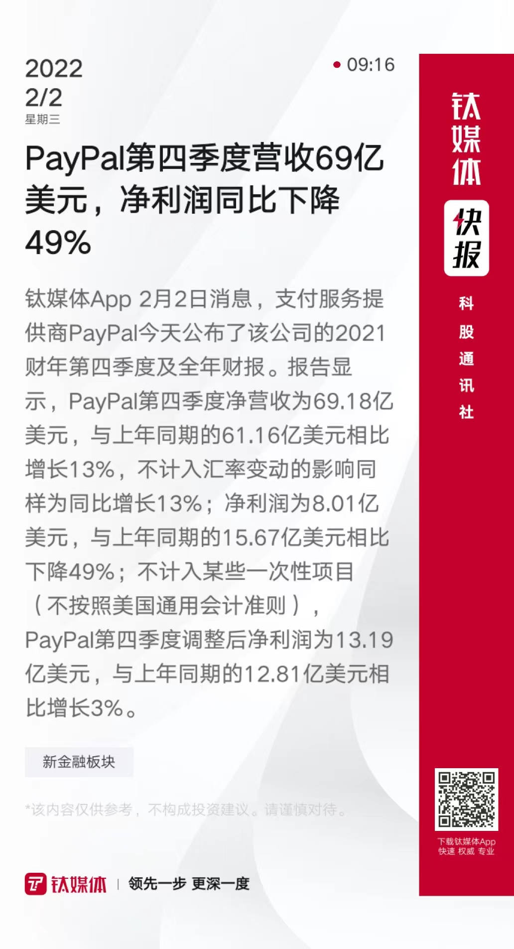 PayPal第四季度营收69亿美元,净利润同比下降49%