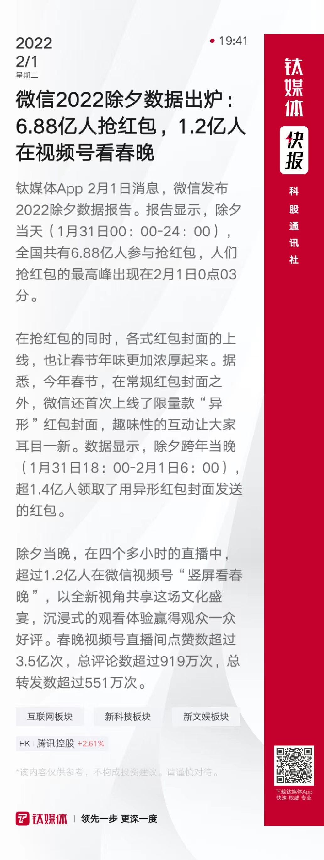 微信2022除夕数据出炉:6.88亿人抢红包,1.2亿人在视频号看春晚