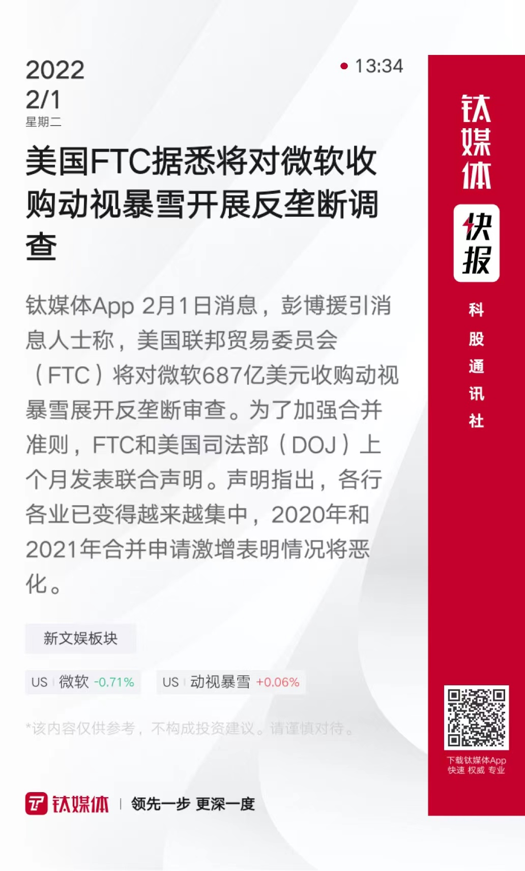 美国FTC据悉将对微软收购动视暴雪开展反垄断调查
