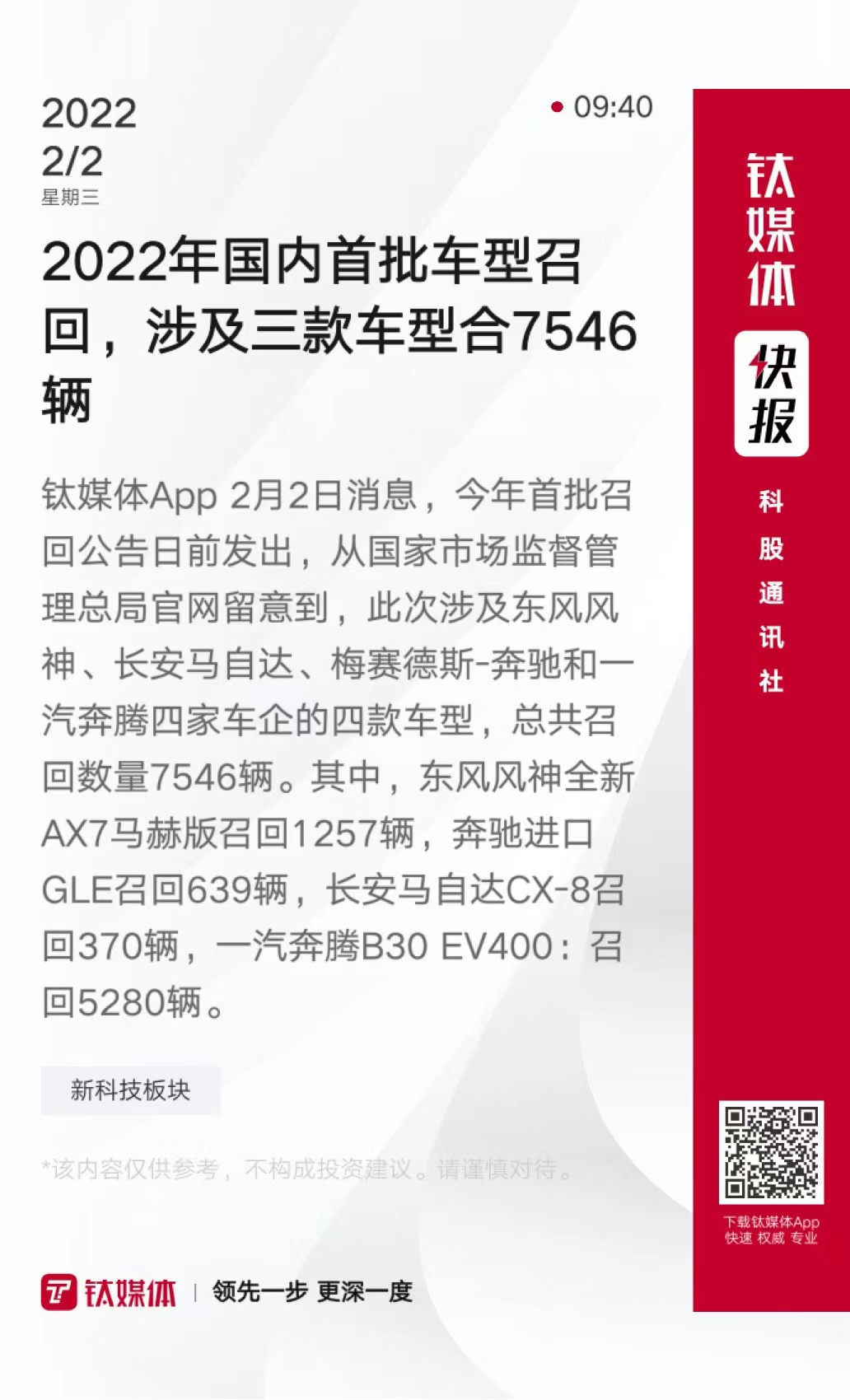2022年国内首批车型召回,涉及三款车型合7546辆
